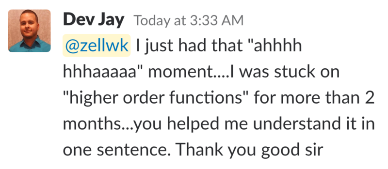 Zell explains things in a way that no other instructor has been able to do in my 15+ years of trying to “self-educate” in the world of Javascript.